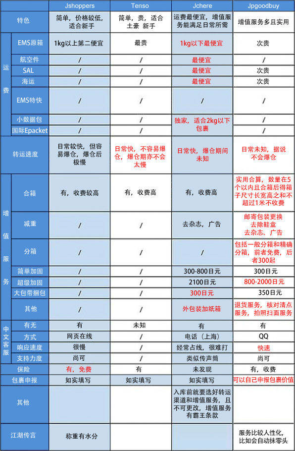 EMS是四家转运公司都有的服务,除了土豪Tenso以外,每家的价格和速度都差不多,JSHOPPERS最便宜,但称重有水分,而Jchere我个人觉得还是挺实在的,没有手续费但是运费比JSHOPPERS贵5%,总的算下来Jchere会比JSHOPPERS贵几十日元。