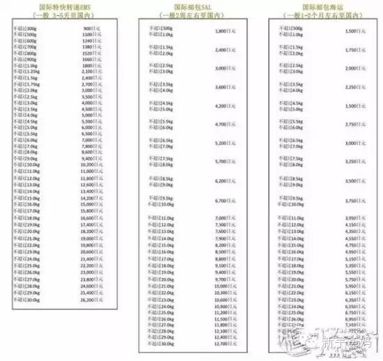 然后我们来讲讲这四种方式的费用。费用各个转运网都有,但不免私自更改嫌疑。因此我们统一来参照日本邮便官方价格。